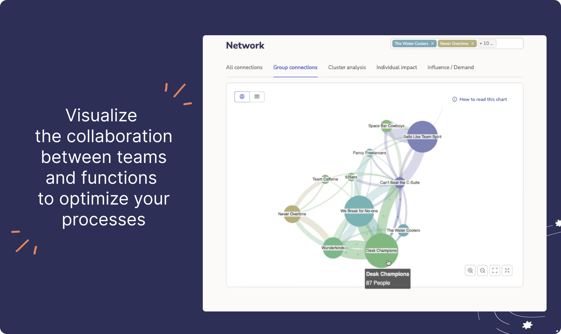 Organisational Network Analysis answers these questions based on current data and helps you understand how teams can improve their collaboration, your key functions’ vulnerability to change, as well as which employees are the most influential. This knowledge empowers leaders to plan growth and structural changes in an informed way, improve team dynamics, and pre-empt employee churn.