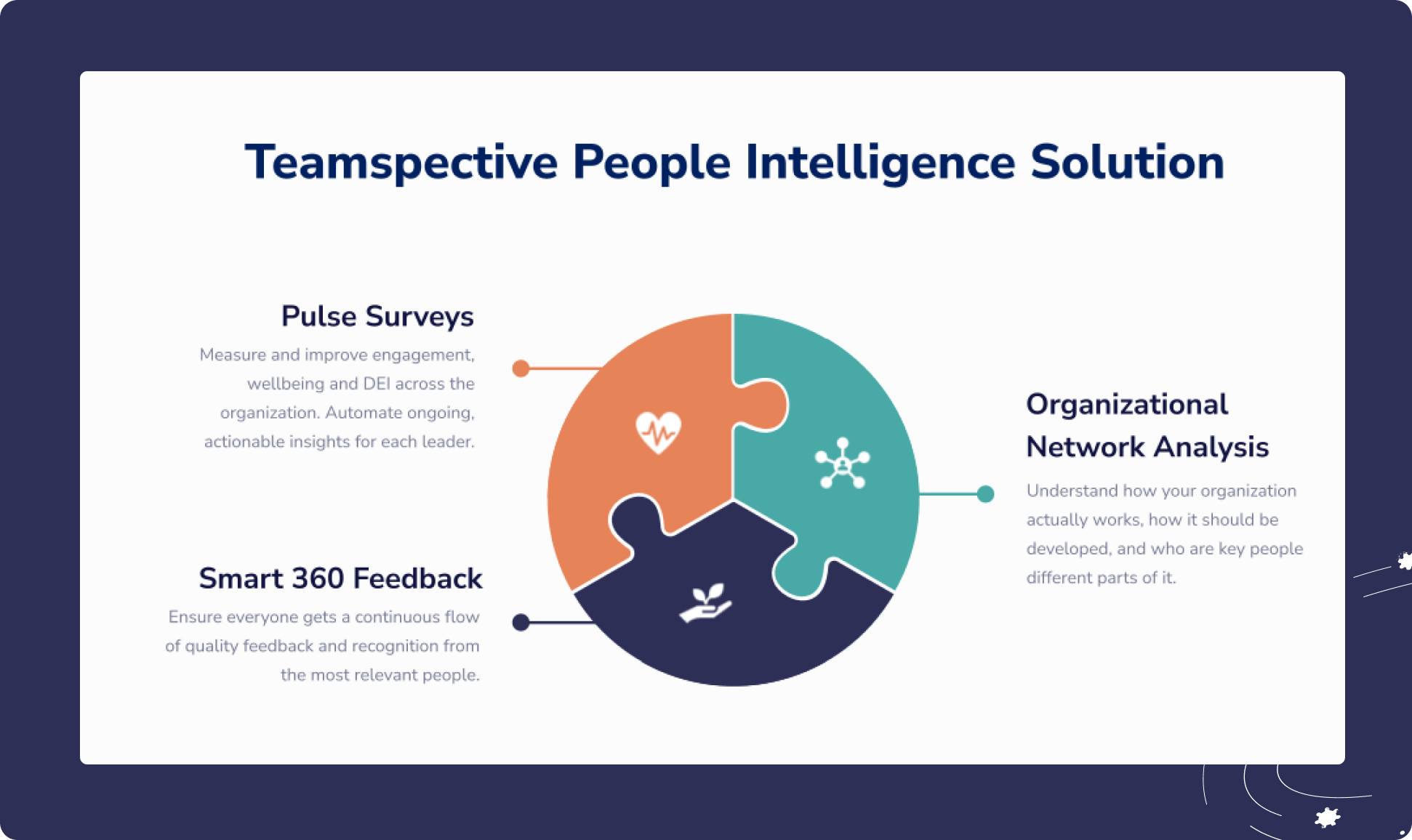 At Teamspective, we consider people analytics to be a part of people intelligence: an around-the-year process of learning about organisation’s real networks, measuring employee engagement and performance, and constantly taking actions based on this data. This approach creates multiple benefits: