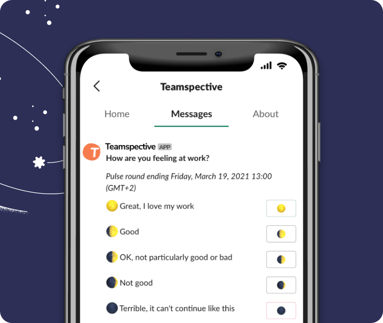 Regular data collection won’t help if the surveys are long and boring. It is important to ask the right questions and make answering easy. We suggest integrating surveys to employees’ daily tools such as Slack or MS Teams. That’s what we did with Teamspective’s pulse surveys, and our users love it!