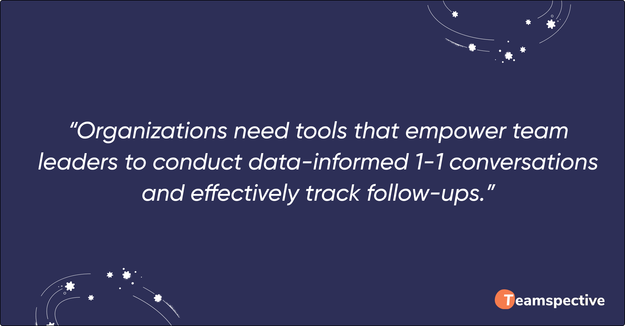 - Inconsistent quality: The quality of 1-1s can vary greatly. This can be due to the experience level of the manager, agendas and action points not being recorded, or critical data such as engagement, feedback, or business KPIs not being used for preparing for 1-1s. A high level of inconsistency directly impacts the ROI of having one-on-one discussions.