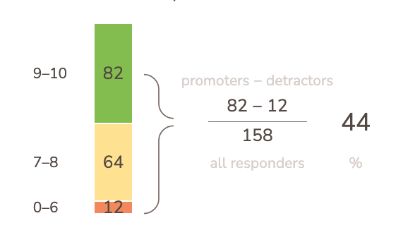 The actual eNPS score, though, is not just an average of these answers. Instead, it indicates the percentage of “promoting” minus the percentage of “detracting” employees. “Promoters” are those answering with a 9 or 10. “Detractors” are those who respond with a score lower than 7. Other responses are only counted in the total sum of responses.