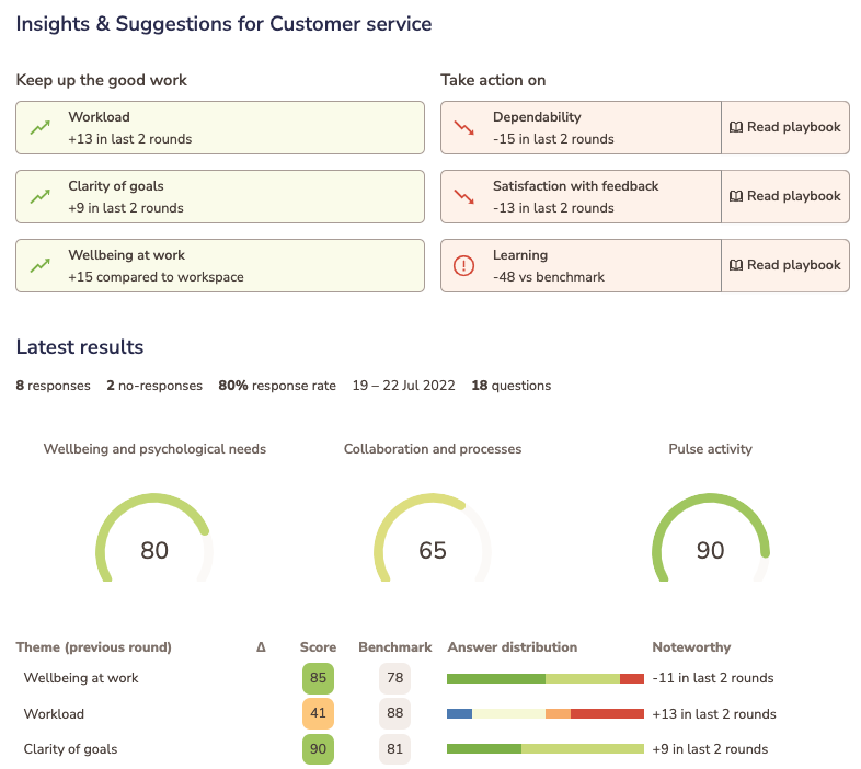 Our research shows that in 83% of cases, the solutions needed to improve eNPS benchmarks should be team-focused rather than company-wide initiatives. That’s why Teamspective encourages each team to establish routines for analyzing and addressing pulse results, with easy access to data and actionable recommendations.
