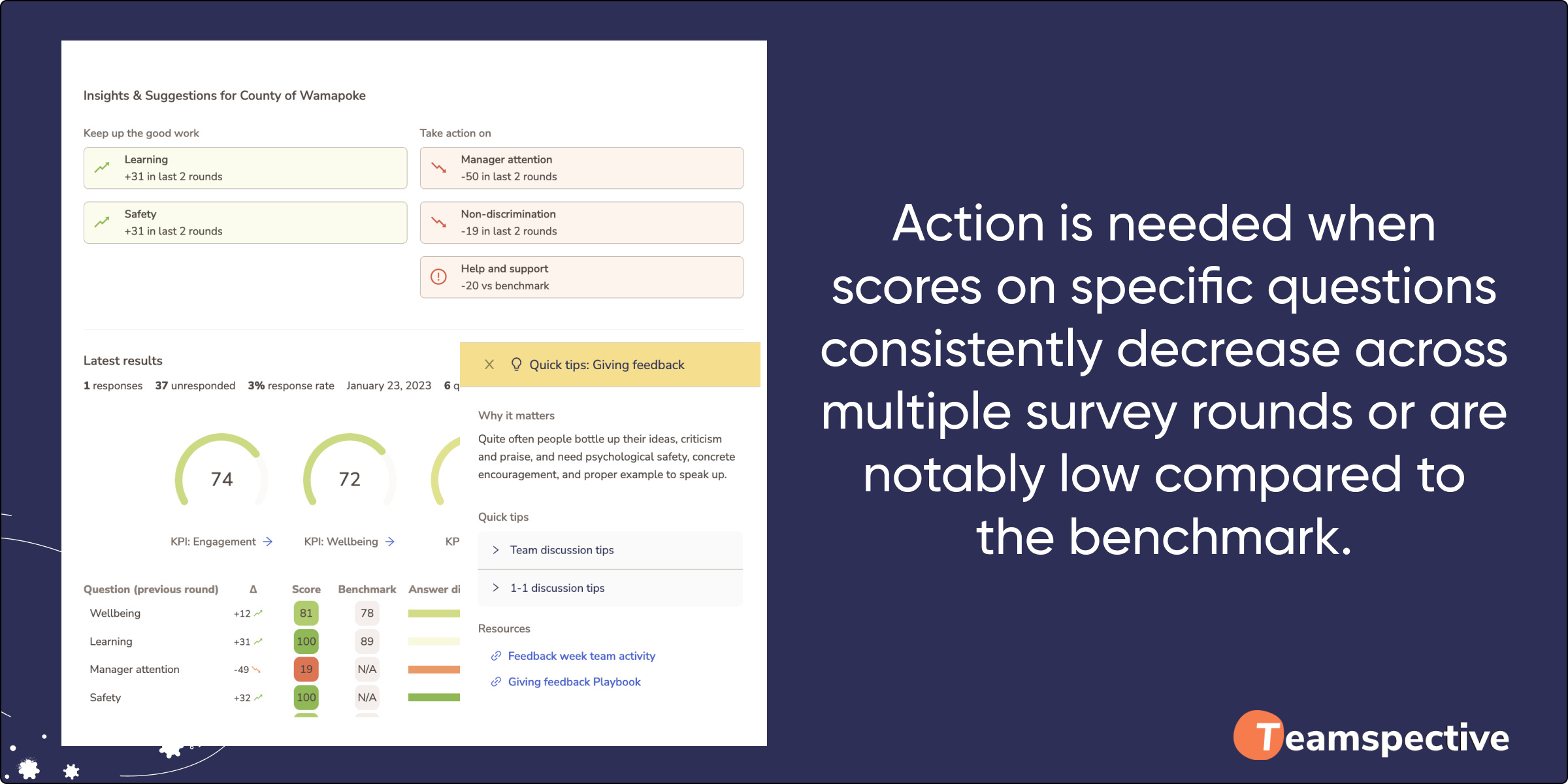 It’s tempting to think that having pulse surveys in place is enough to improve team wellbeing and collaboration. However, it is even more important to create a routine of taking action and monitoring progress on the collected results.