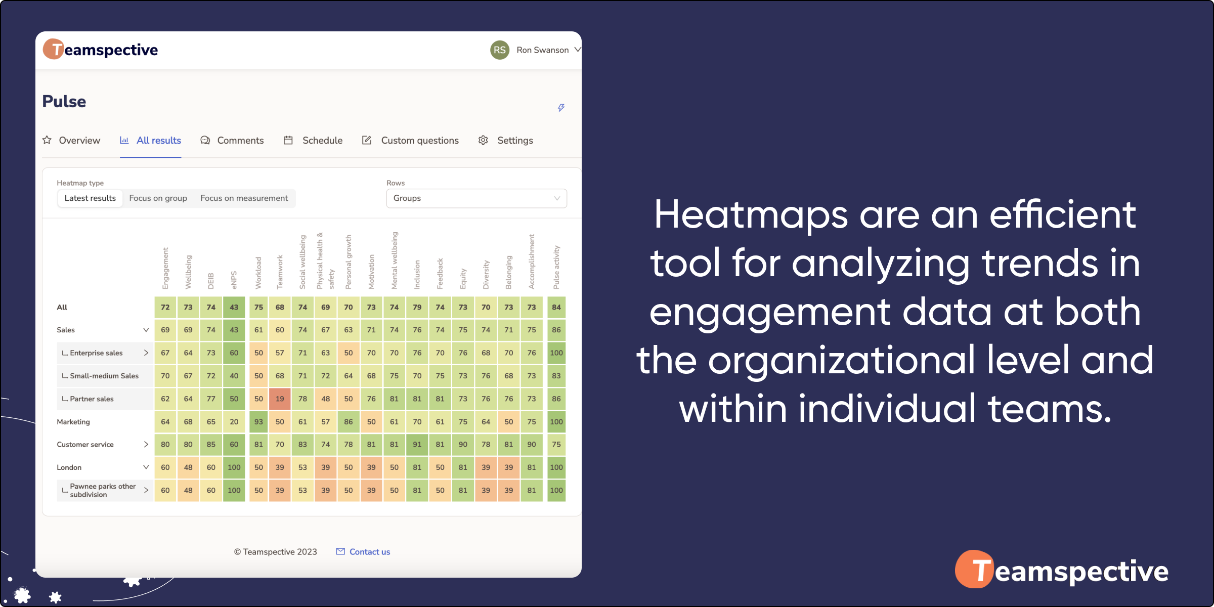Pulse surveys are typically owned by HR managers who should ensure that individual team leads understand data and solve issues in their teams. Team leaders are often busy with their daily tasks, which can lead to engagement data being neglected. Offering training and workshops for leaders is crucial in order to establish a culture of continuous improvement. This is also something Teamspective’s professional services team can help you with.