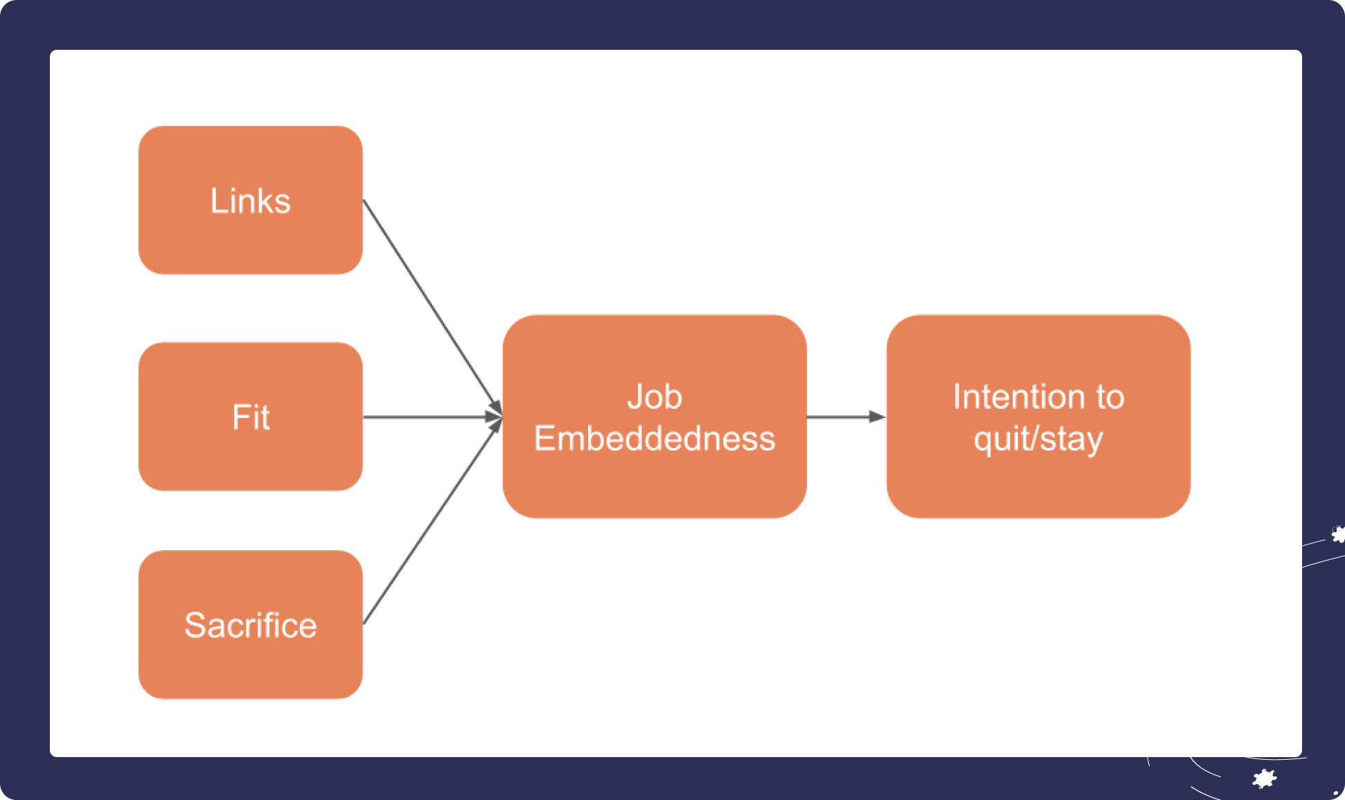 Job embeddedness theory suggests that an employee’s “links” within the organization are one of the three main components determining a person’s likelihood to remain committed to their job.