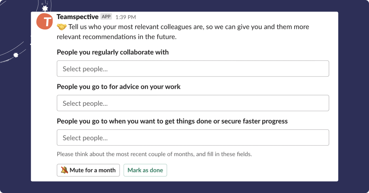 For example, Teamspective automatically surveys users at regular intervals in Slack or MS Teams to ask with whom they are working closely right now! After that, this data is used to help each employee get meaningful feedback from their closest teammates.