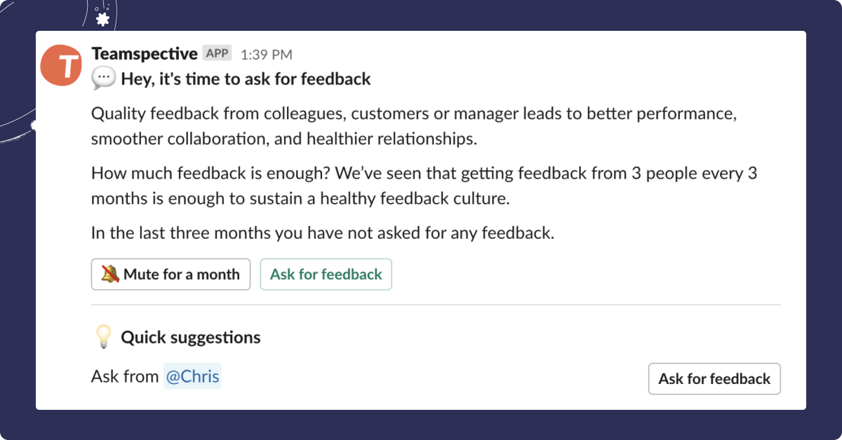 If you use Teamspective, this process is as guided and easy as possible. Feedback requests arrive into Slack, MS Teams, or email, and with one click you can start writing. While you write, the app provides guidelines for topic definition and shares questions one could answer to be as constructive and to the point as possible!